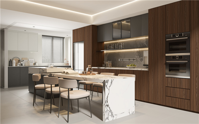 餐廚一體,是理想生活的全新提案。海創(chuàng)整家定制,通過頂、墻、門、柜的同色同紋一體化設計,讓美感與功能渾然天成,為您實現(xiàn)無論現(xiàn)代輕奢、精致意式、雅致新中式或溫暖原木風的全風格駕馭。我們以系統(tǒng)性思維規(guī)劃空間。例如,廚房選用抗油耐污的博格鋁蜂窩大板,與墻面、櫥柜保持和諧的白灰色調,吊柜巧妙點綴,視覺連貫統(tǒng)一。此色調與設計語言可一直延伸至餐廳區(qū)域,形成大氣高端的整體感。布局上更具巧思,可將餐廳環(huán)繞于廚房之中,打造兼具中島與餐桌功能的核心區(qū),增強家人互動,讓空間利用率與收納效能最大化。從一板一色到整體格局,海創(chuàng)提供真正的省心整家定制。在這里,烹飪與歡聚無縫銜接,讓每一天都向陽而生。more +12月