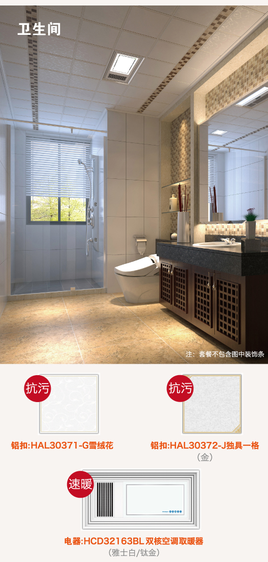 注:廚房和衛(wèi)生間單間面積按4.05平米計(jì)算,超出部分按店內(nèi)折扣價(jià)計(jì)算,特價(jià)板與廚衛(wèi)套餐不同時(shí)享受。
