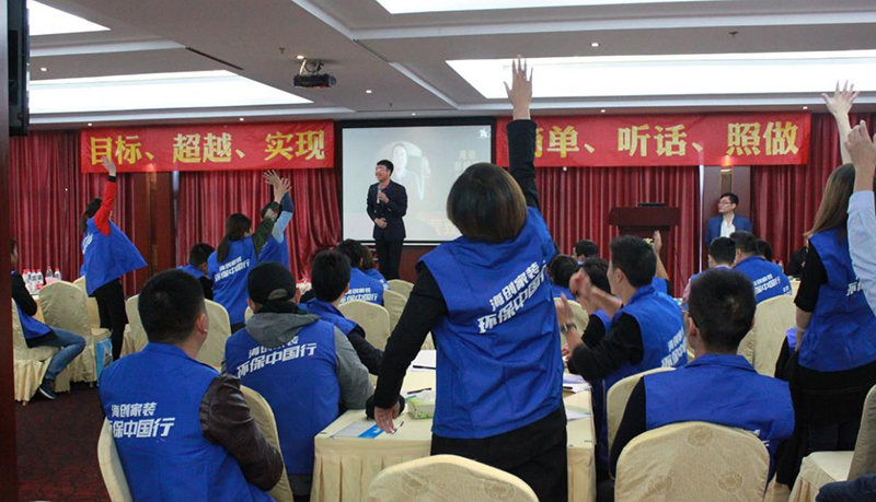 領導致辭環(huán)節(jié),海創(chuàng)總經理陳華因地制宜,機智開場。以海寧名人金庸為切入點,引用金庸作《射雕英雄傳》中郭靖角色的武功前后對比,向經銷商闡述努力勤奮的重要性,引發(fā)全體共鳴!