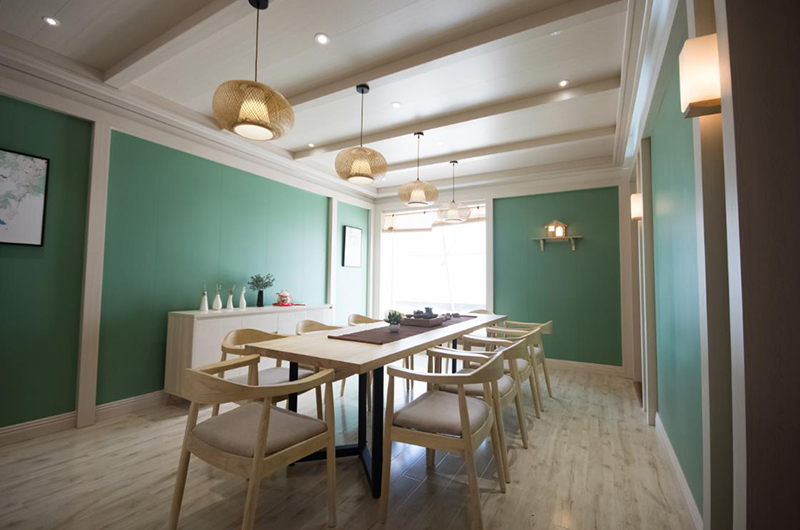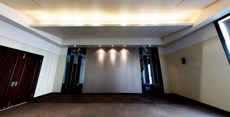 2017年,海創(chuàng)商學(xué)院增設(shè)了設(shè)計(jì)、安裝等培訓(xùn)科目,內(nèi)容由淺入深,一年多以來共培訓(xùn)了200多家門店,300多位學(xué)員。而這間會(huì)議室正是為商學(xué)院準(zhǔn)備的,此后的培訓(xùn)將能在自己展廳進(jìn)行,以便更加直觀更加深入。會(huì)議室頂部使用竹木墻板,打造波浪形的錯(cuò)層效果,既達(dá)到吸音效果,又讓會(huì)議室呈現(xiàn)得莊重大氣。