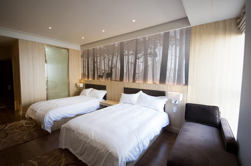 其風(fēng)格簡約,格調(diào)清新,床頭背景的大幅3D打印暗示著自然寧靜的氛圍,與墻面的清灰色形成統(tǒng)一的印象,木紋的色彩清淡,紋理自然,頗具親和感,定位給青年旅舍十分恰當(dāng),如果稍加更換顏色和畫面,又可以變換成另外一種主題。