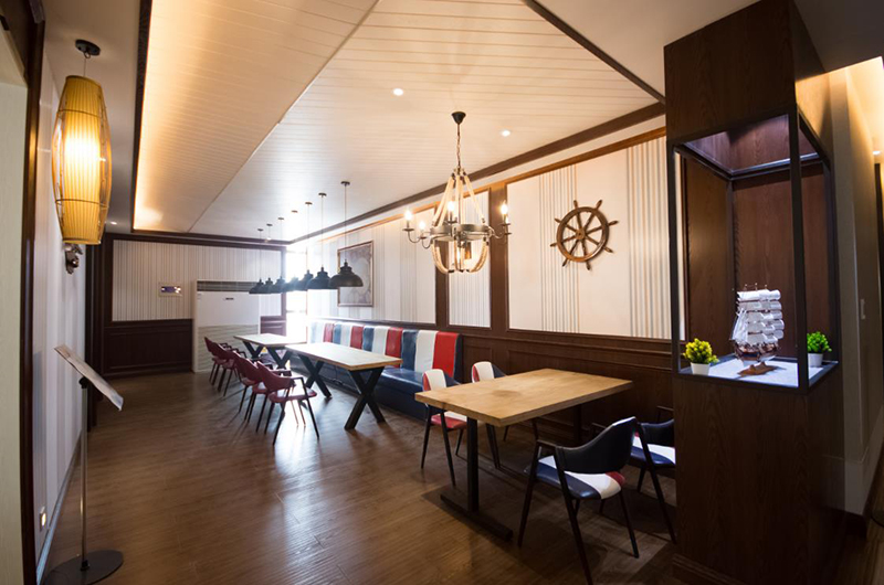 過道盡頭順勢做了一間咖吧,從轉(zhuǎn)角的船模到深處的大航海地圖,不難看出它的海賊王主題,從家具到燈飾都是濃濃的復(fù)古工業(yè)風(fēng)。條紋的墻板和座椅相呼應(yīng)協(xié)調(diào),鮮艷的紅藍(lán)色還帶有一種幽默的卡通味道。頂部的條形板模仿船艙的夾板,傾斜的拼法是為了制造海上的搖晃流動(dòng)感?;椟S的燈光營造出酒吧咖吧所需要的迷離氛圍。