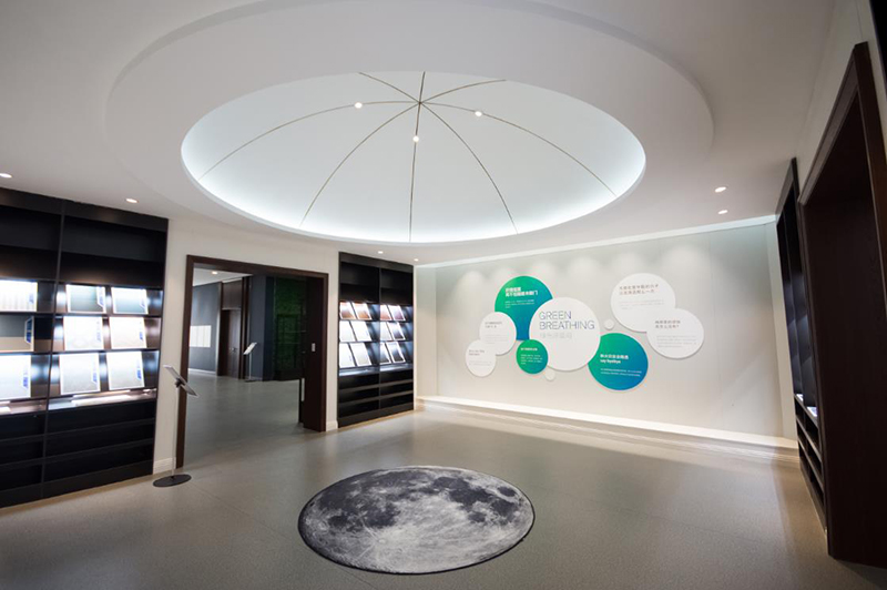 展覽室處于整個(gè)建筑的軸心位置,需要穩(wěn)定的格局,除了采用了全對稱的布局外又設(shè)置了一個(gè)球形的頂形成了類似羅馬建筑的制高點(diǎn),其造型猶如一個(gè)未打開的觀星臺(tái),設(shè)計(jì)師以此刻意制造了一種意境的延伸感,使得觀者行至此處都會(huì)駐留片刻,潛意識(shí)中隱隱等待著一種升華。
