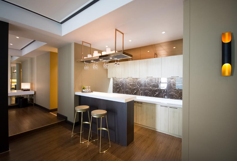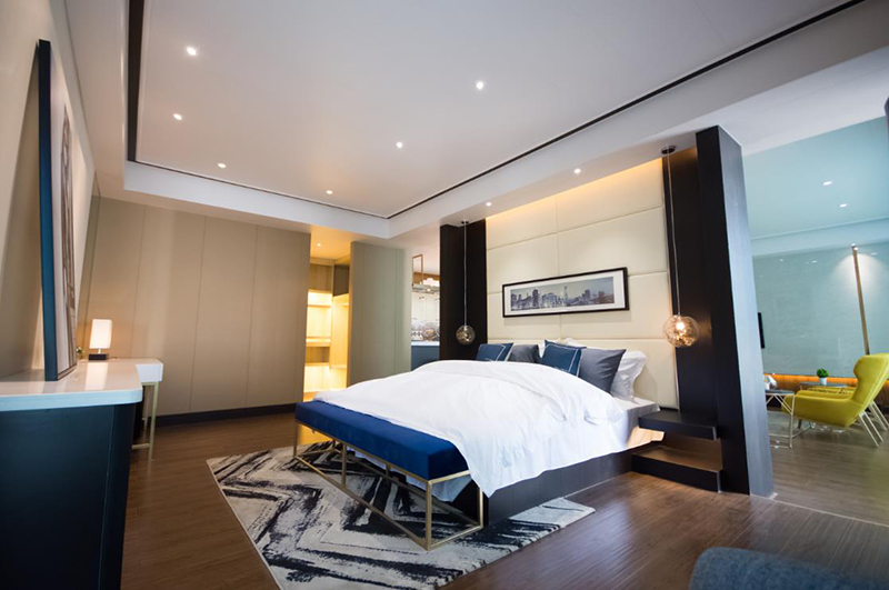 皮衣之都海寧地處富庶的江南,不僅文化底蘊(yùn)豐厚且現(xiàn)代感十足,是一座人口不多卻非常時(shí)尚摩登的城市。設(shè)計(jì)師把“輕摩登”的概念植入到了這套頗有國際范的公寓式酒店客房。簡潔大氣的造型,完備精致的功能決定了此套客房的高檔次。大量運(yùn)用的皮革硬包墻面,時(shí)尚貴氣的墻紙加上閃爍的玫瑰金亮面,更強(qiáng)化了奢華的氛圍。湛藍(lán)色的布藝軟飾和黑白的時(shí)裝攝影又帶入了一分現(xiàn)代和時(shí)尚。