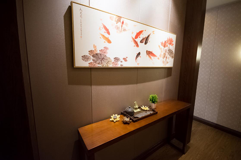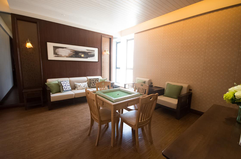 去過重慶的人都說還沒下飛機(jī)就已經(jīng)聽到麻將聲,雖然夸張,但是四川人愛打麻將確是出了名的。在四川,麻將館更是鋪天蓋地,卻是很少有把麻將館也裝修的如此考究的,大概多少還知道玩麻將是不務(wù)正業(yè),所以設(shè)計(jì)師特意掛上一掛鐘提醒在麻將娛樂的同時(shí)也不要忘了回家。另外,這間麻將包廂從墻面到軟搭還頗具民國時(shí)期特色,入口還設(shè)置了一幽靜處不僅起到緩沖作用,還能焚香以求手氣順。門口外布置了一座流水觀音把霉運(yùn)擋在外面,也能暗示人們化解心中功利。