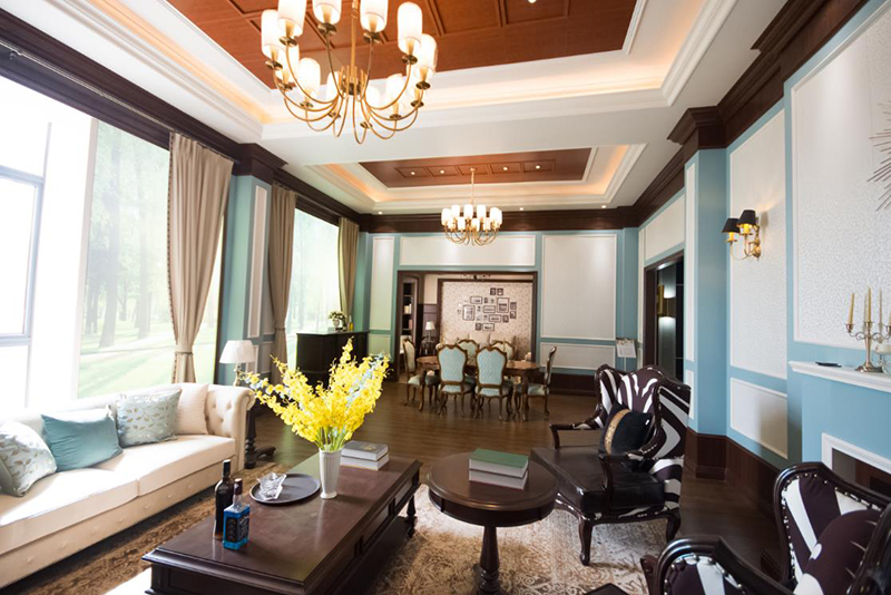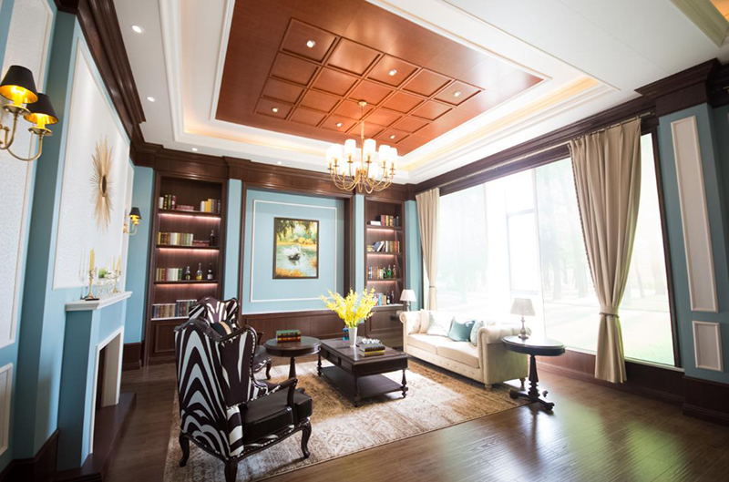 英式風(fēng)格嚴(yán)謹(jǐn)而莊重,體現(xiàn)著優(yōu)雅知性的紳士風(fēng)度。通常整屋不留空隙地運(yùn)用老榆木線板結(jié)構(gòu)來做裝飾,雖然檔次較高,但是沉重有余而輕松不足,不太符合當(dāng)下開放自由的社會(huì)主旋律。所以在設(shè)計(jì)此案例時(shí)選擇了水藍(lán)色和白色來改變厚重的印象,讓它更加生動(dòng)又兼具優(yōu)雅,同時(shí)質(zhì)感和層次也更加細(xì)膩。整體造型和功能上保持了英式的莊重典雅和知性的文化格調(diào),特別是有那一分薩克斯般的爵士味。