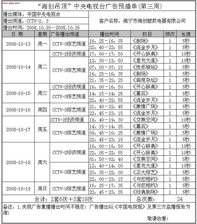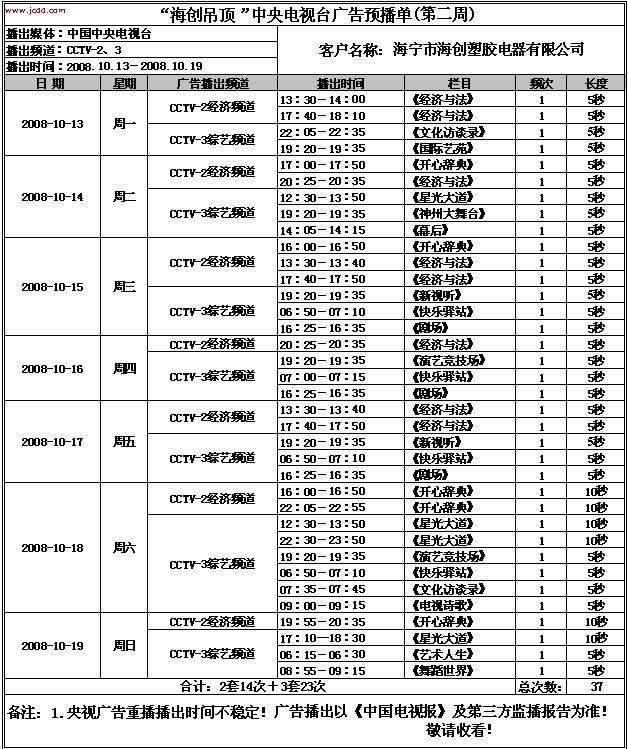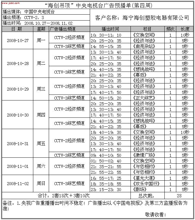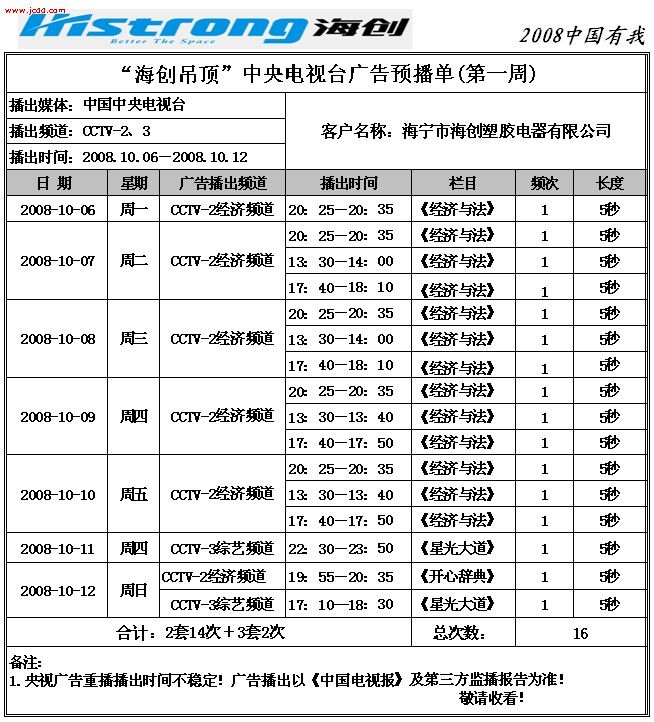 【最新資訊】“海創(chuàng)吊頂”中央電視臺(tái)廣告預(yù)播單(10月份)來源:海創(chuàng)集成吊頂十大品牌     發(fā)布時(shí)間:2008/9/28 13:50:00