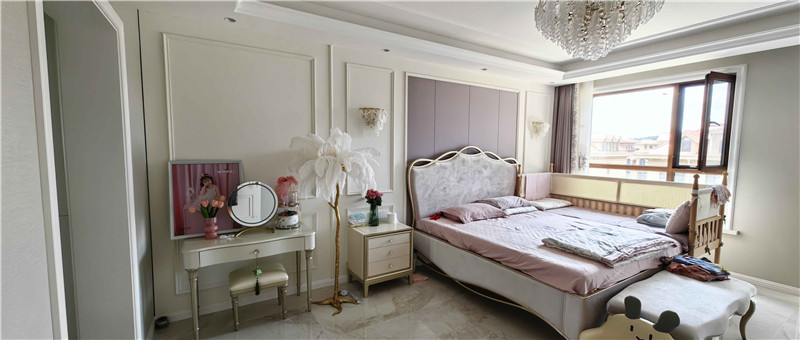 臥室空間以紫色點睛,不至于讓一眾純白讓居室顯得單調(diào),溫馨中又多了一絲高貴與精致。