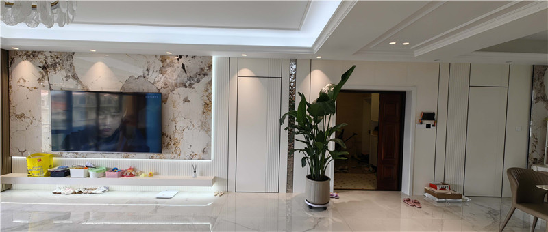 電視背景墻使用高光仿大理石紋結(jié)合格柵打造,簡約時尚,倒映熠熠燈光,擴大視覺感,讓空間看起來更大。