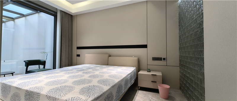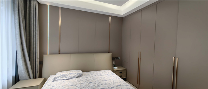 臥室緊鄰客廳,一面帶隱形門的背景墻將其完美隱藏,既保證臥室的私密性,又延續(xù)了客廳的完整度。