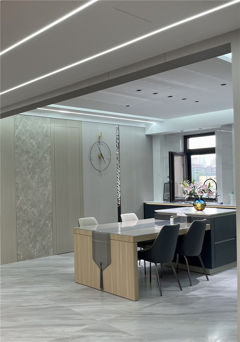 過道和餐廳是石紋與銀灰色系的組合,沉穩(wěn)內(nèi)斂,潛藏家的深厚底蘊。