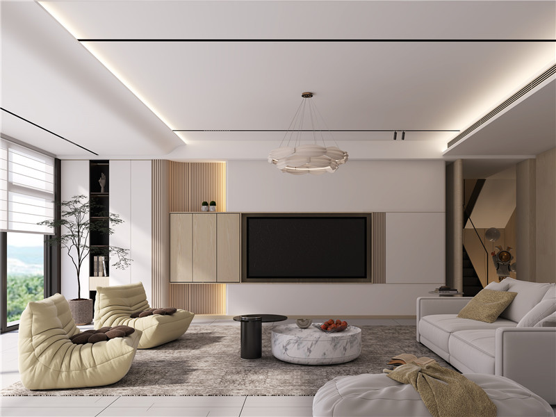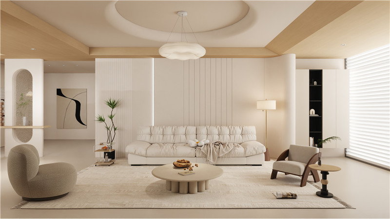 客廳是家人互動(dòng)的核心,海創(chuàng)以低飽和度的奶油白為主調(diào),搭配淺木色系,營造出通透柔和的視覺感。沙發(fā)背景墻或是采用立體波浪設(shè)計(jì),光影流轉(zhuǎn)間如奶油般絲滑;亦或是融合定制柜做拼接,以微錯(cuò)層立體感呈現(xiàn)絲滑過渡。
