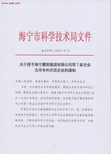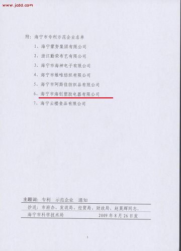 為進一步強企業(yè)專利制度建設,推進企業(yè)技術進步和自主創(chuàng)新,增強企業(yè)核心競爭力,根據(jù)《海寧市專利示范企業(yè)管理(試行)辦法》的規(guī)定,經(jīng)海寧市科技局審核,海寧市海創(chuàng)塑膠電器有限公司被授予海寧市專利示范企業(yè)稱號。