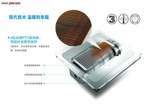 酷睿系列風暖電器選用了金屬PTC發(fā)熱體,作為取暖器的核心器件。與傳統(tǒng)的燈暖模塊相比,金屬PTC發(fā)熱體最大的特點是安全可靠,升溫迅速,只需數(shù)分鐘即可達到洗浴溫度。它由兩組發(fā)熱模塊組成,最大功率2400W,配有延時器、溫控器和熱熔斷裝置各一塊。溫控器可自動偵測溫度變化,如風扇電機故障無法送風,或取暖器內(nèi)部溫度過高,金屬PTC可自動減小功率,以保持合理的安全溫度。即使風扇電機停機和金屬PTC自動調(diào)節(jié)功能失效,達到一定溫度時,熱熔斷器也會自動熔斷,只保留一組發(fā)熱模塊正常工作,保證高度安全。
